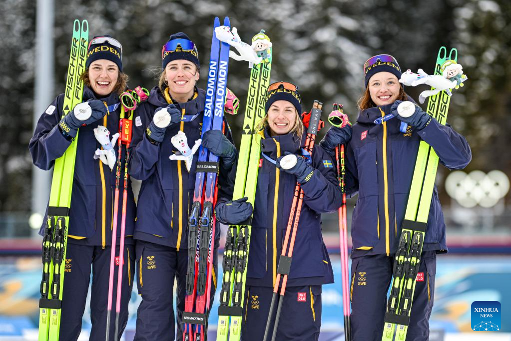 Silver medalists of Sweden pose for photos during the awarding ceremony of the biathlon women’s 4x6km relay at the 2026 Milan-Cortina Winter Olympics in Anterselva, Italy, Feb. 18, 2026. (Xinhua/Jiang Han)