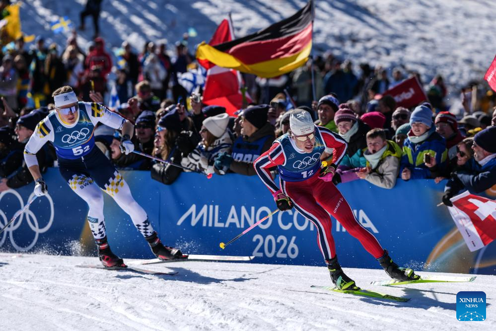 Johannes Hoesflot Klaebo (R) of Norway competes during the cross-country skiing men’s team sprint free final at the Milan-Cortina 2026 Olympic Winter Games in Tesero, Italy, Feb. 18, 2026. (Xinhua/Peng Ziyang)