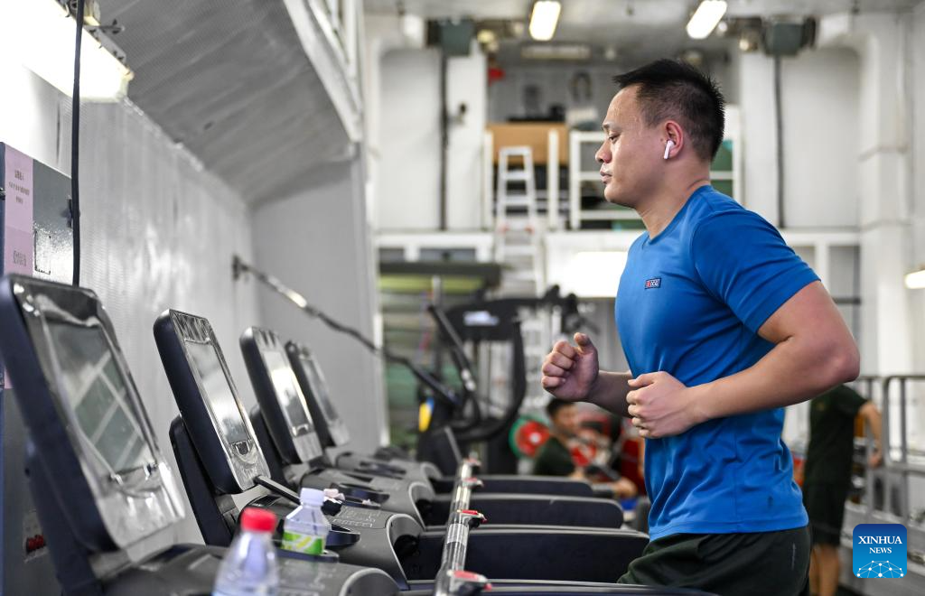A law enforcer exercises on the China Coast Guard (CCG) vessel Huangyan during a patrol mission in the territorial waters of China’s Huangyan Dao, Nov. 9, 2025.
