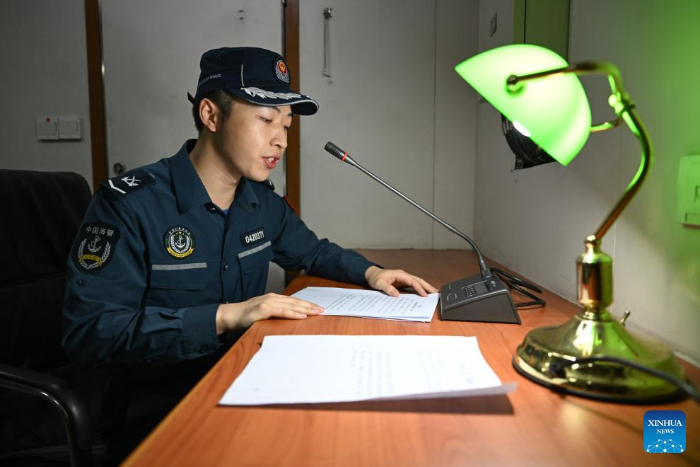A law enforcer broadcasts before a meal on the China Coast Guard (CCG) vessel Huangyan during a patrol mission in the territorial waters of China’s Huangyan Dao, Dec. 5, 2025.
