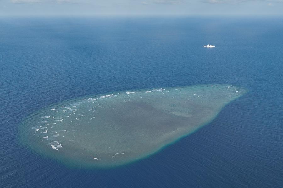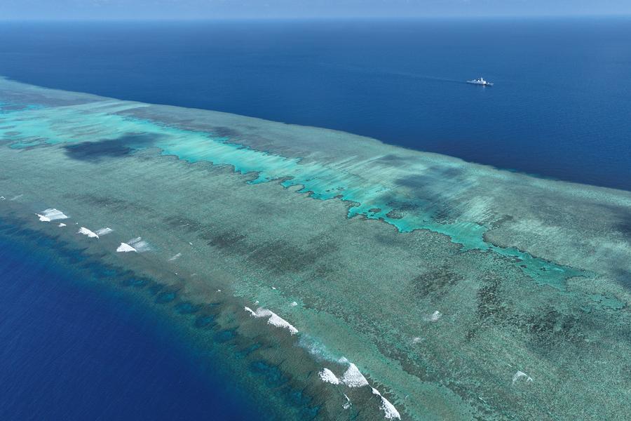 An aerial drone photo shows the China Coast Guard (CCG) vessel Sandu patrolling near a reef in the South China Sea on March 24, 2026. (Xinhua/Mao Jun)■
