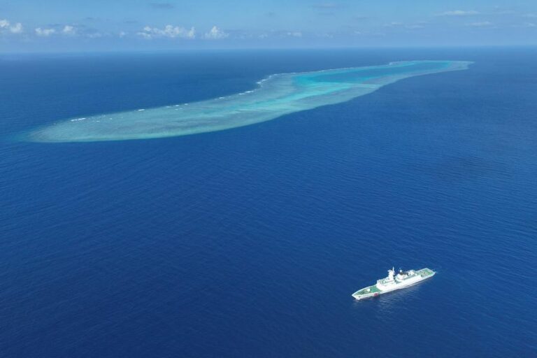 An aerial drone photo shows the China Coast Guard (CCG) vessel Sandu patrolling near a reef in the South China Sea on March 24, 2026. (Xinhua/Mao Jun)