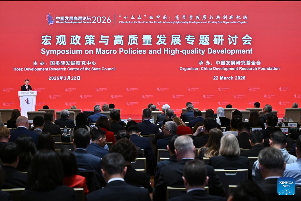 This photo taken on March 22, 2026 shows a symposium on macro policies and high-quality development during the China Development Forum 2026 in Beijing, capital of China. The China Development Forum 2026 kicked off in Beijing on Sunday. The theme of this year’s forum is “China in Its 15th Five-Year Plan Period: Advancing High-Quality Development and Creating New Opportunities Together.” (Xinhua/Li Xin)