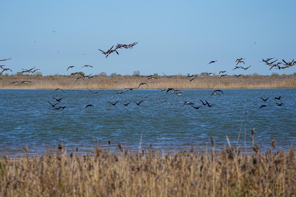 A flock of migratory birds fly above the Yellow River Delta National Nature Reserve in Dongying, east China’s Shandong Province, Nov. 13, 2025. (Xinhua/Zhu Zheng)