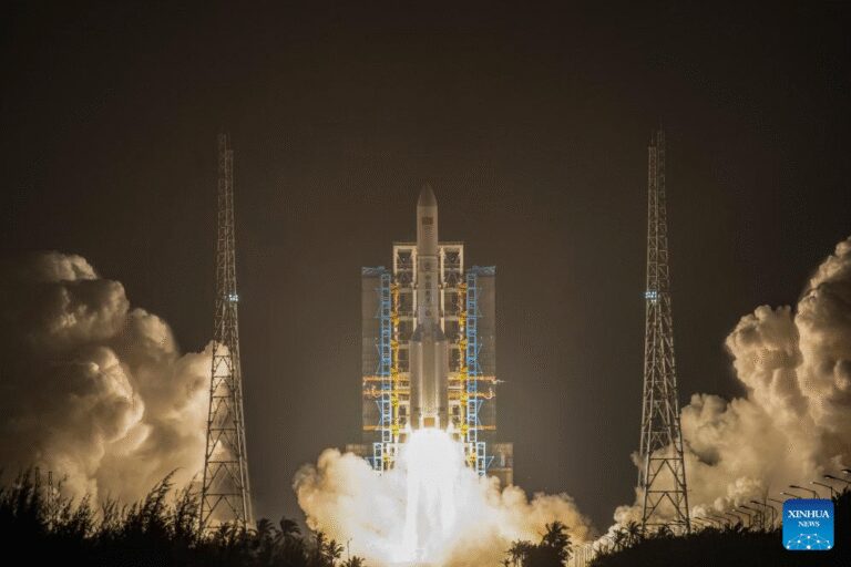 A Long March-5 rocket carrying a new communication technology test satellite blasts off from Wenchang Space Launch Site in south China’s Hainan Province, Oct. 23, 2025. (Photo by Du Xinxin/Xinhua)