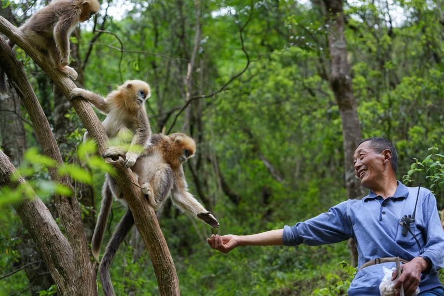 A ranger interacts with Sichuan golden snub-nosed monkeys in the Pingwu Sichuan golden snub-nosed monkey popular science education base in Pingwu County, Mianyang City of southwest China’s Sichuan Province, May 21, 2025. (Xinhua/Jiang Hongjing)