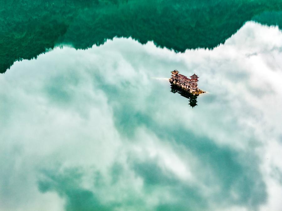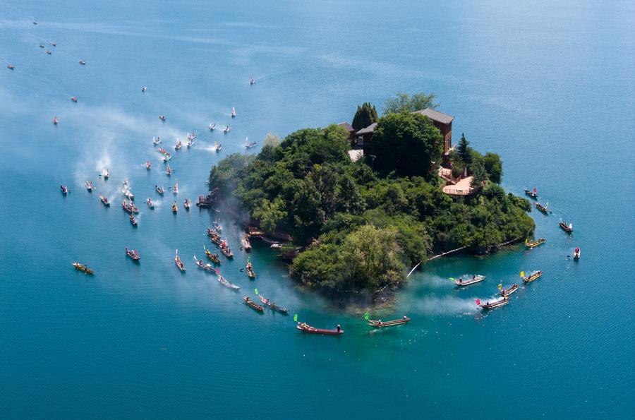 An aerial drone photo taken on Sept. 16, 2025 shows local people sailing around an island while circling the lake by boat in Yanyuan County of Liangshan Yi Autonomous Prefecture, southwest China’s Sichuan Province. (Xinhua/Jiang Hongjing)