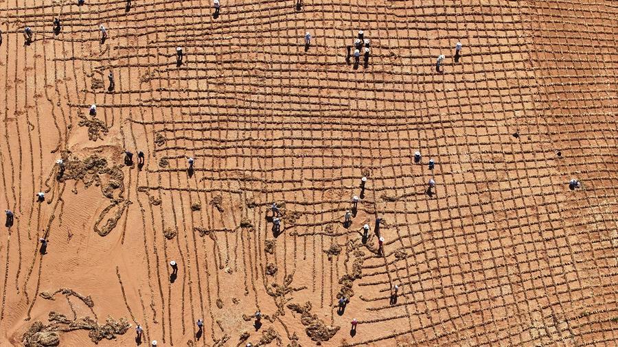 An aerial drone photo taken on June 30, 2025 shows people laying sand barriers at the site of a desertification control project in Zhongewei, northwest China’s Ningxia Hui Autonomous Region. (Xinhua/Wang Peng)