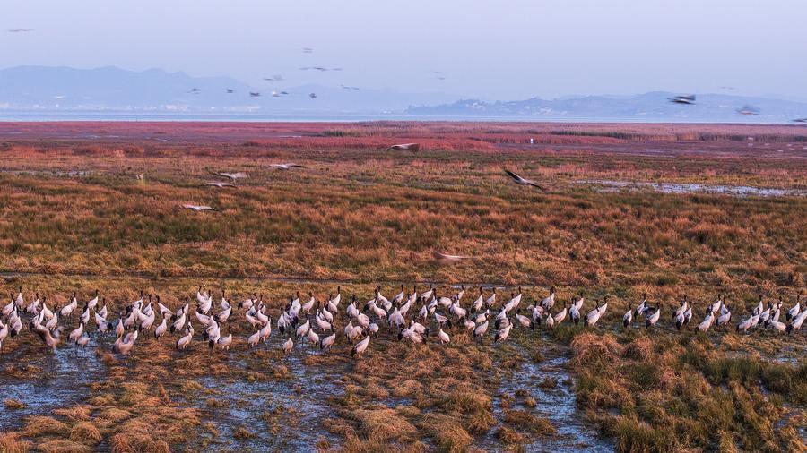 A drone photo shows black-necked cranes at Caohai National Nature Reserve in Yi-Hui-Miao Autonomous County of Weining, southwest China’s Guizhou Province, Dec. 1, 2025. (Xinhua/Yang Wenbin)