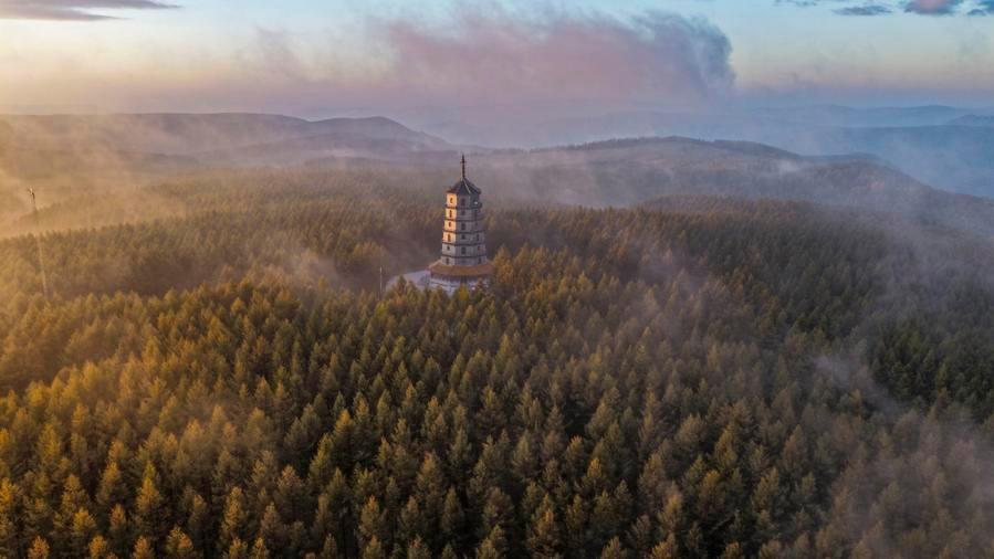An aerial drone photo taken on Sept. 24, 2025 shows the autumn scenery in the Saihanba National Forest Park in Chengde City, north China’s Hebei Province. (Photo by Liu Mancang/Xinhua)