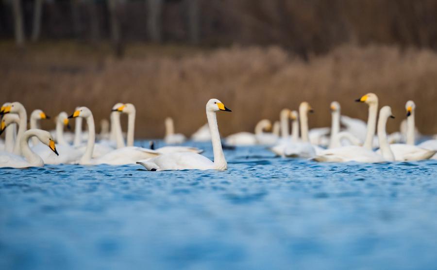 This photo taken on Dec. 20, 2025 shows swans at a wetland in Sanmenxia, central China’s Henan Province. (Photo by Zhao Yongtao/Xinhua)