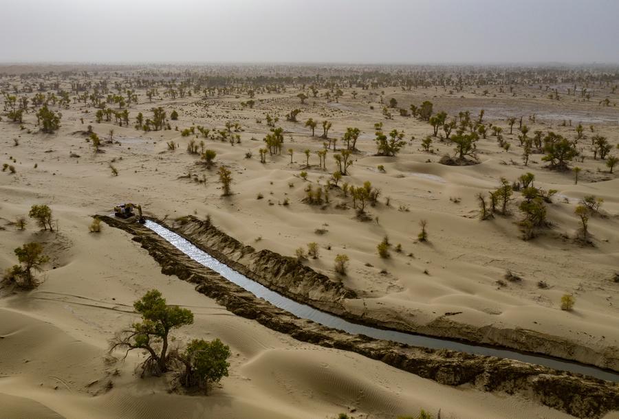 An aerial drone photo taken on Sept. 19, 2025 shows an artificially excavated ecological canal for flood diversion and water replenishment in Taklimakan Desert in Yuli County, Mongolian Autonomous Prefecture of Bayingolin, northwest China’s Xinjiang Uygur Autonomous Region. (Xinhua/Chen Shuo)