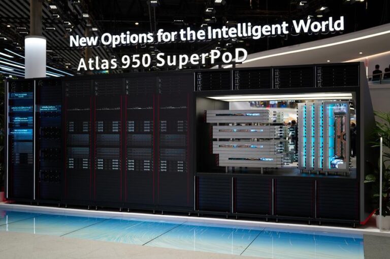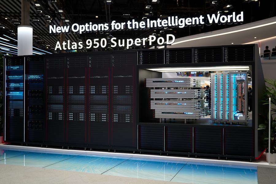 This photo taken on March 2, 2026 shows Huawei’s Atlas 950 SuperPoD at the 2026 Mobile World Congress in Barcelona, Spain. (Xinhua/Meng Dingbo)