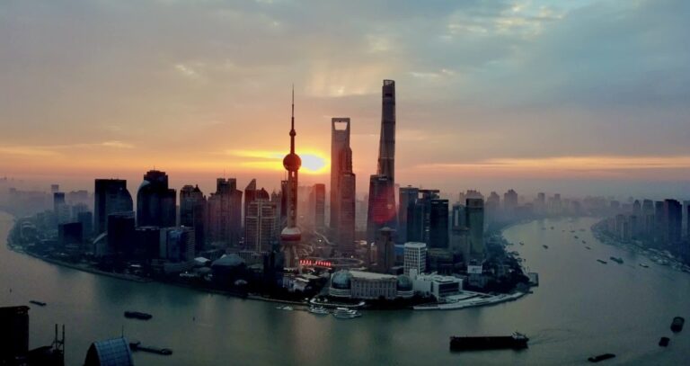 SHANGHAI, CHINA – JANUARY 1: The sun rises over the Oriental Pearl Tower in Shanghai, China on New Year’s Day, January 1, 2023. (Photo by VCG/VCG via Getty Images)