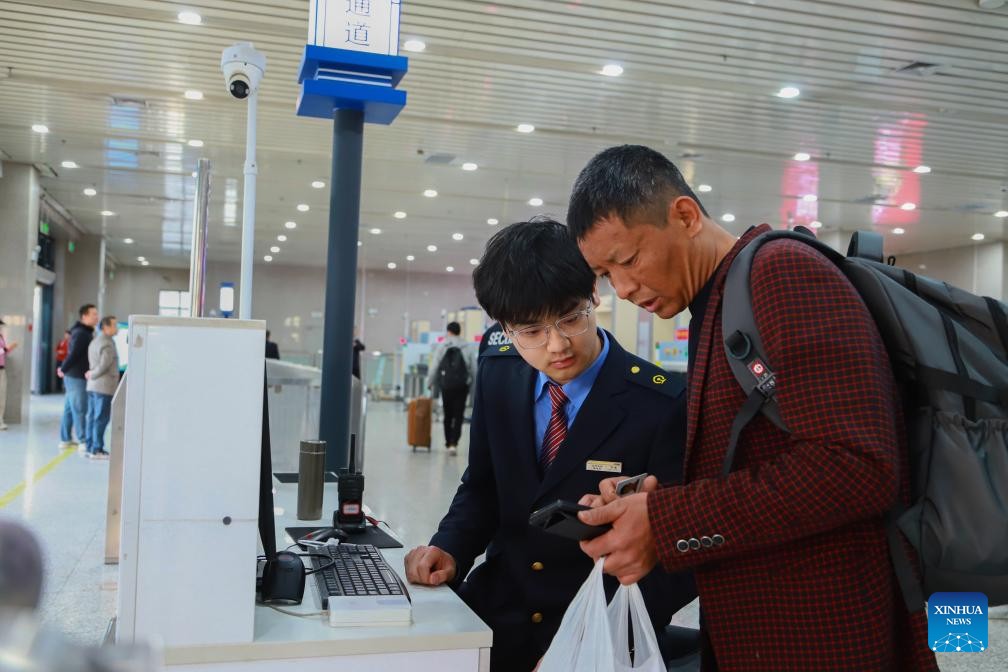 A staff member helps a passenger at Lanzhou Railway Station in Lanzhou City, northwest China’s Gansu Province, on April 6, 2026. An estimated 845.38 million passenger trips were made across China during the three-day Qingming Festival holiday, up 6 percent year on year, transportation authorities said on Monday.