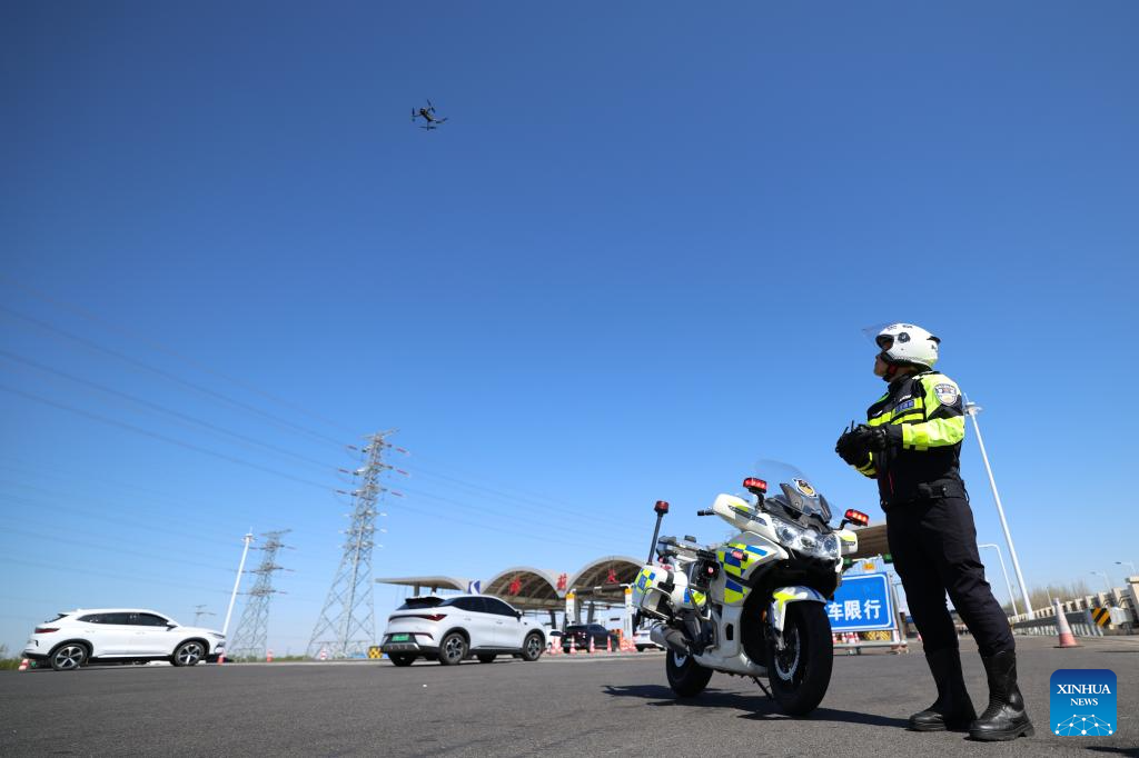 A traffic police operates a drone to conduct patrols at a toll station of an expressway in north China’s Tianjin, April 6, 2026. An estimated 778.45 million road trips were made across China during the three-day Qingming Festival holiday, rising 5.8 percent from the same period last year, according to the Ministry of Transport. (Xinhua/Sun Fanyue)