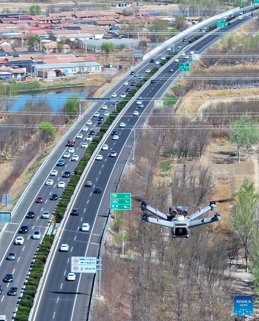 A drone photo taken on April 6, 2026 shows a drone conducting patrols over an expressway in north China’s Tianjin. An estimated 778.45 million road trips were made across China during the three-day Qingming Festival holiday, rising 5.8 percent from the same period last year, according to the Ministry of Transport. (Xinhua/Sun Fanyue)
