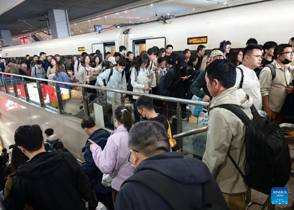 Passengers walk after getting off a train at Guangzhou South Railway Station in Guangzhou City, south China’s Guangdong Province, on April 6, 2026. An estimated 845.38 million passenger trips were made across China during the three-day Qingming Festival holiday, up 6 percent year on year, transportation authorities said on Monday.