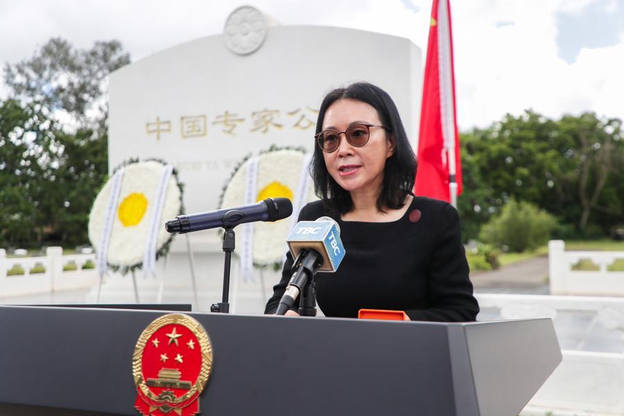 Chinese Ambassador to Tanzania Chen Mingjian delivers a speech during a joint commemoration at the Chinese Expert Cemetery in Dar es Salaam, Tanzania, on April 4, 2026. (Xinhua/Emmanuel Herman)