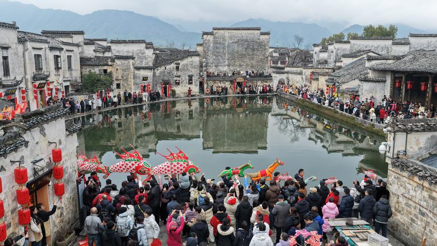 An aerial drone photo taken on Feb. 17, 2026 shows people attending a folk activity in Yixian County, east China’s Anhui Province. (Photo by Wang Cheng/Xinhua)