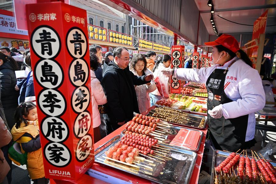 People buy candied fruits at a fair in Qingdao, east China’s Shandong Province, Feb. 17, 2025. (Xinhua/Li Ziheng)■