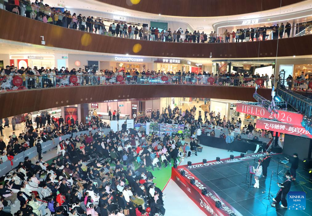 People watch a performance at a shopping mall in Nanyang, central China’s Henan Province, Jan. 1, 2026. China’s economy kicked off 2026 with robust momentum, as evidenced by bustling economic activity in the year’s first days. (Photo by Gao Song/Xinhua)