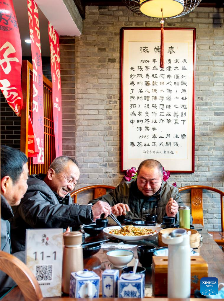 People enjoy morning tea at a time-honored restaurant in Taizhou, east China’s Jiangsu Province, Jan. 2, 2026. China’s economy kicked off 2026 with robust momentum, as evidenced by bustling economic activity in the year’s first days. (Photo by Yang Yugang/Xinhua)