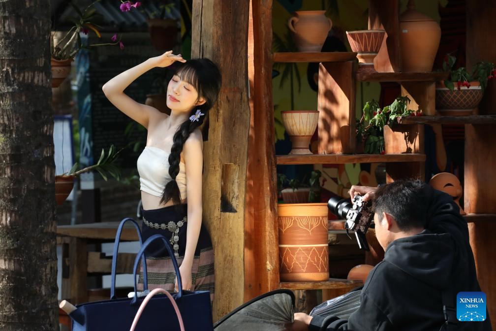 Tourists take photos at an ancient hamlet in Jinghong, southwest China’s Yunnan Province on Jan. 2, 2026. China’s economy kicked off 2026 with robust momentum, as evidenced by bustling economic activity in the year’s first days. (Photo by Li Yunsheng/Xinhua)