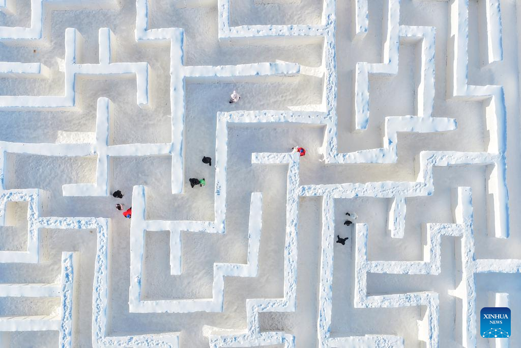 An aerial drone photo taken on Jan. 2, 2026 shows visitors exploring a giant maze made of ice and snow in Tongjiang, northeast China’s Heilongjiang Province. China’s economy kicked off 2026 with robust momentum, as evidenced by bustling economic activity in the year’s first days. (Photo by Liu Wanping/Xinhua)
