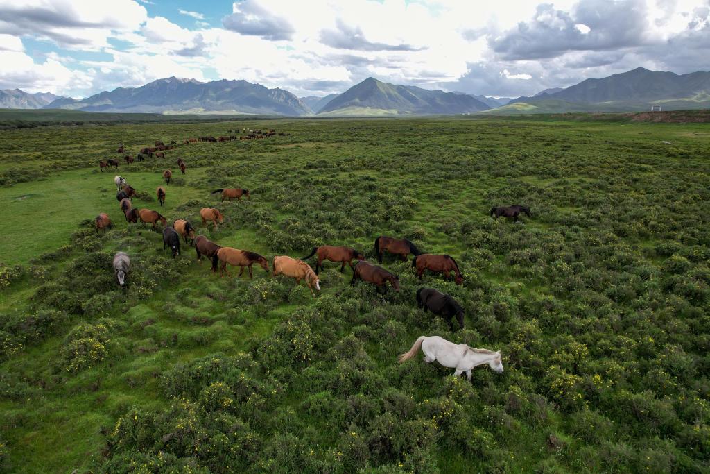 A drone photo shows a herd of horses foraging at the Shandan Horse Breeding Farm in northwest China’s Gansu Province, July 10, 2024. (Xinhua/Lang Bingbing)