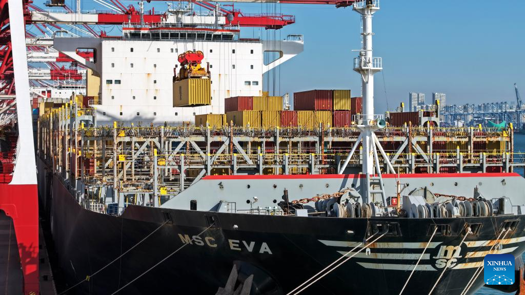 This photo taken on Dec. 8, 2025 shows a cargo ship at a container terminal of Qingdao Port in Qingdao, east China’s Shandong Province. The cargo throughput of Qingdao Port in 2025 surpassed 700 million tonnes on Monday, reaching this milestone 15 days earlier compared to 2024.