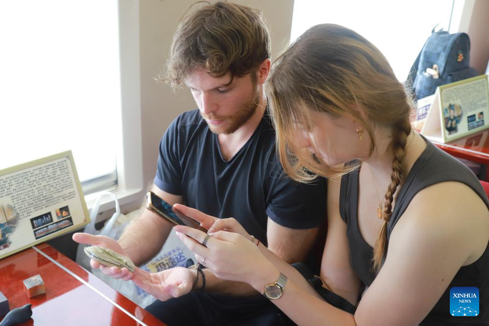 This photo taken on a train bound for Guangzhou City of south China’s Guangdong Province shows French passengers admiring a piece of Shoushan stone carving work displayed on the train on Oct. 1, 2025. China’s railway network handled a record-high number of passenger trips during the first 11 months of 2025, data from the country’s railway operator showed Tuesday. In the January-November period, the number of railway passenger trips reached 4.28 billion across the country, up 6.6 percent from the same period last year, according to China State Railway Group Co., Ltd. (Xinhua/Zhou Yi)
