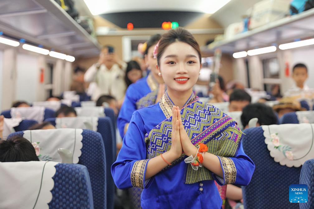 Stewardesses perform Laos dance for passengers aboard train No. D86 from Kunming, capital city of southwest China’s Yunnan Province, to the Laos capital Vientiane, July 18, 2025.