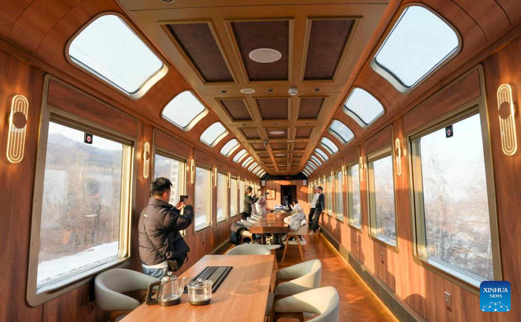 People take photos in a carriage of a tourist train dubbed Yichun, in northeast China’s Heilongjiang Province, Dec. 6, 2025. China’s railway network handled a record-high number of passenger trips during the first 11 months of 2025, data from the country’s railway operator showed Tuesday. In the January-November period, the number of railway passenger trips reached 4.28 billion across the country, up 6.6 percent from the same period last year, according to China State Railway Group Co., Ltd. (Xinhua/Wang Song)