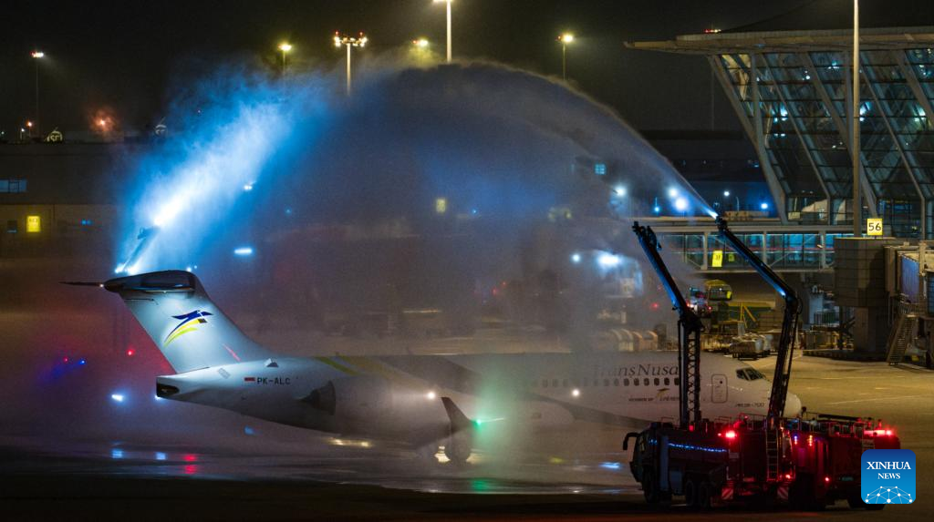 A C909 jetliner of an Indonesian airline lands at Shanghai Pudong International Airport in Shanghai, east China, May 8, 2025. Saturday marks the ninth anniversary of the commercial operation of China’s domestically developed regional jetliner C909. So far, 166 C909 aircraft have been delivered, which have handled over 24 million passenger trips. (Photo by Xu Bingnan/Xinhua)