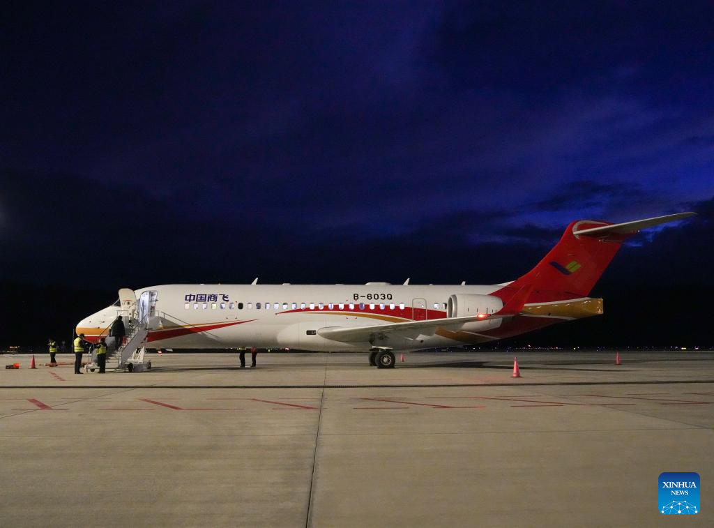 A C909 jetliner is parked at Lhasa Gonggar International Airport in Lhasa, southwest China’s Xizang Autonomous Region, Sept. 21, 2024. Saturday marks the ninth anniversary of the commercial operation of China’s domestically developed regional jetliner C909. So far, 166 C909 aircraft have been delivered, which have handled over 24 million passenger trips. (Xinhua/Ding Ting)