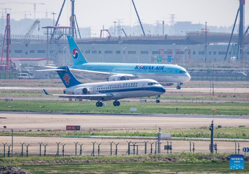 A C909 jetliner (front) of the China Southern Airlines lands at Shanghai Pudong International Airport in Shanghai, east China, April 15, 2025. Saturday marks the ninth anniversary of the commercial operation of China’s domestically developed regional jetliner C909. So far, 166 C909 aircraft have been delivered, which have handled over 24 million passenger trips. (Photo by Xu Bingnan/Xinhua)