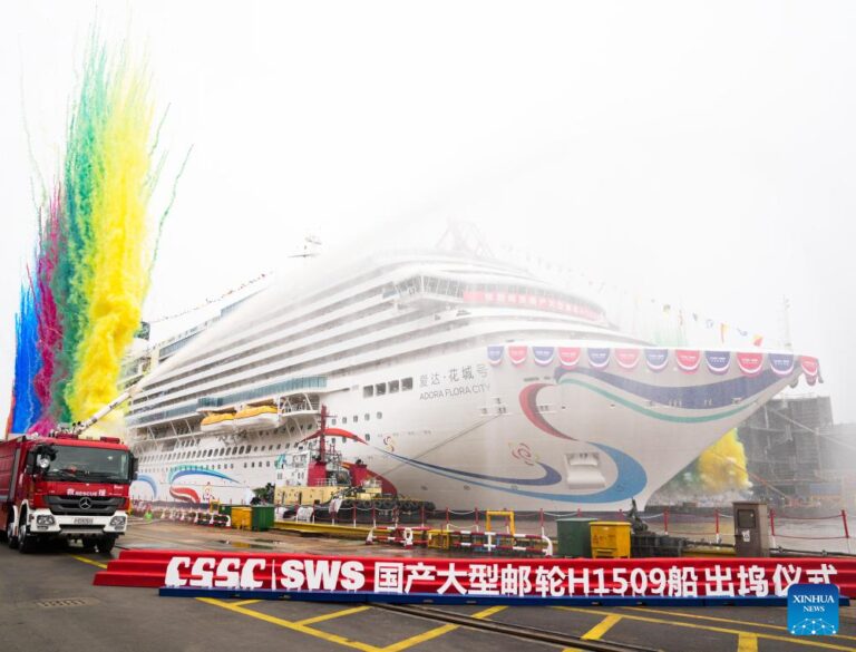 China’s second domestically built large cruise ship Adora Flora City is undocked in Shanghai, east China, March 20, 2026. China’s second domestically built large cruise ship was undocked in Shanghai on Friday, moving a step closer to trial voyages and final delivery as the country expands its push into the cruise tourism market. The vessel, Adora Flora City, was slowly pulled and guided out of the construction dock by powerful tugboats at Shanghai Waigaoqiao Shipbuilding Co., Ltd., a subsidiary of China State Shipbuilding Corporation (CSSC). It will fully enter the wharf commissioning stage, said the shipbuilder. (Xinhua/Ding Ting)