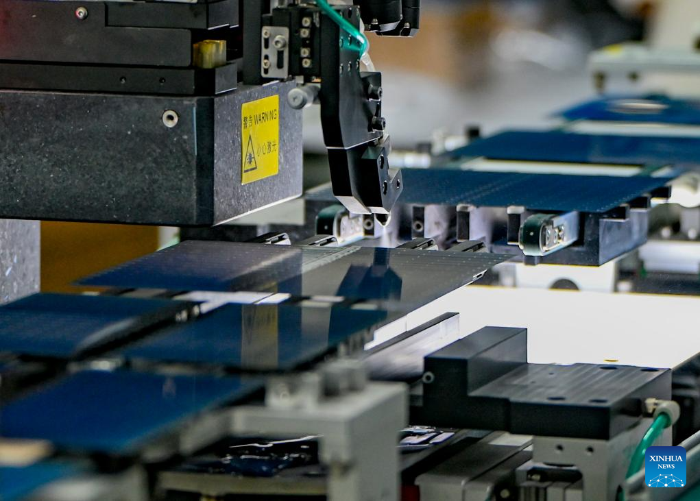 This photo taken on Sept. 22, 2025 shows an automatic machine cutting photovoltaic panels at the workshop of a new energy company in Ruoqiang County, Mongolian Autonomous Prefecture of Bayingolin, northwest China’s Xinjiang Uygur Autonomous Region. Xinjiang, a region rich in solar and wind energy resources, has vigorously developed the new energy industry in recent years, accelerating the construction of large-scale wind and photovoltaic power base projects.