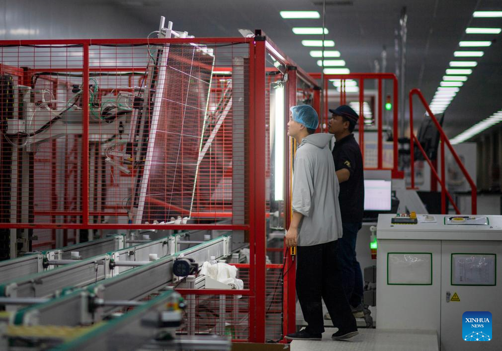 Staff members work on the production line of photovoltaic panels at the workshop of a new energy company in Ruoqiang County, Mongolian Autonomous Prefecture of Bayingolin, northwest China’s Xinjiang Uygur Autonomous Region, Sept. 22, 2025. Xinjiang, a region rich in solar and wind energy resources, has vigorously developed the new energy industry in recent years, accelerating the construction of large-scale wind and photovoltaic power base projects.