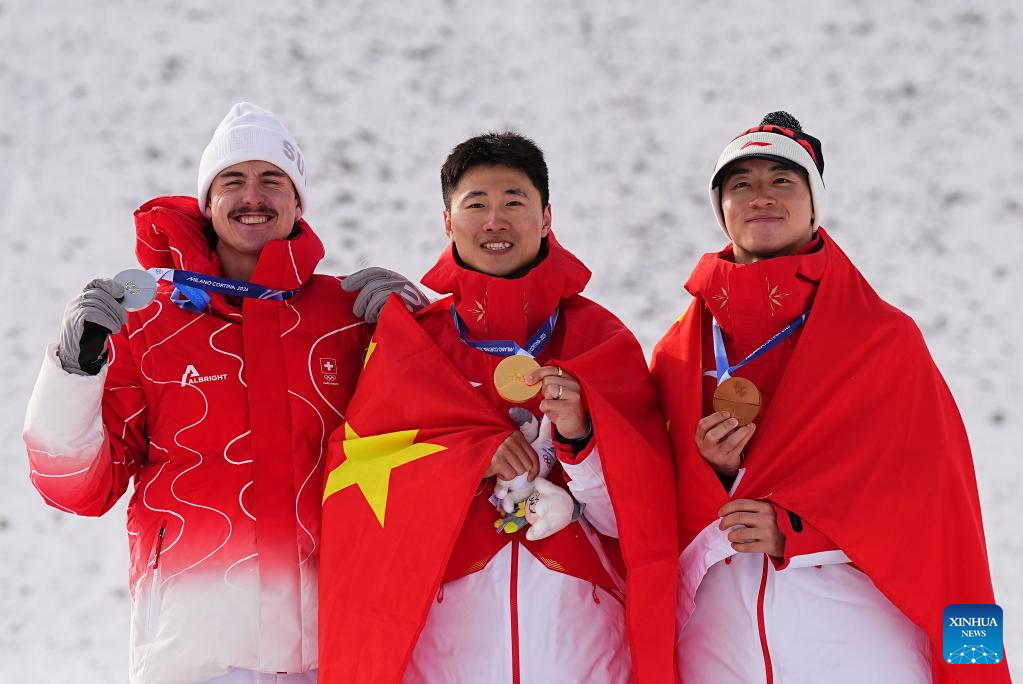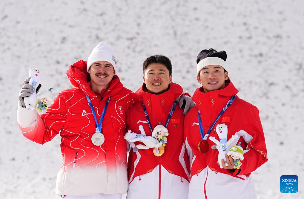 Silver medalist Noe Roth of Switzerland, gold medalist Wang Xindi of China and his teammate bronze medalist Li Tianma (L to R) pose during the awarding ceremony of the freestyle skiing men’s aerials at the Milan-Cortina 2026 Olympic Winter Games in Livigno, Italy, Feb. 20, 2026. (Xinhua/Wu Huiwo)