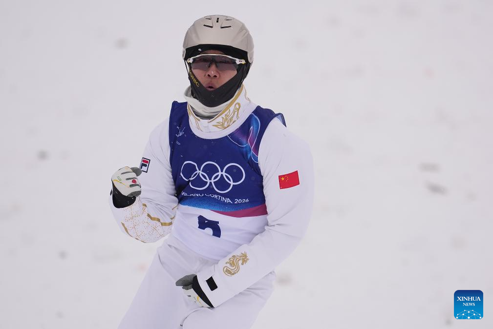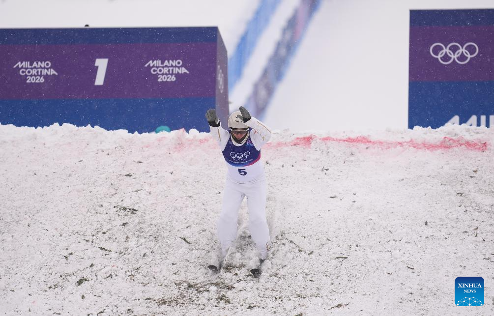 Wang Xindi of China reacts during the freestyle skiing men’s aerials qualification 1 at the Milan-Cortina 2026 Olympic Winter Games in Livigno, Italy, Feb. 20, 2026. (Xinhua/Hu Chao)