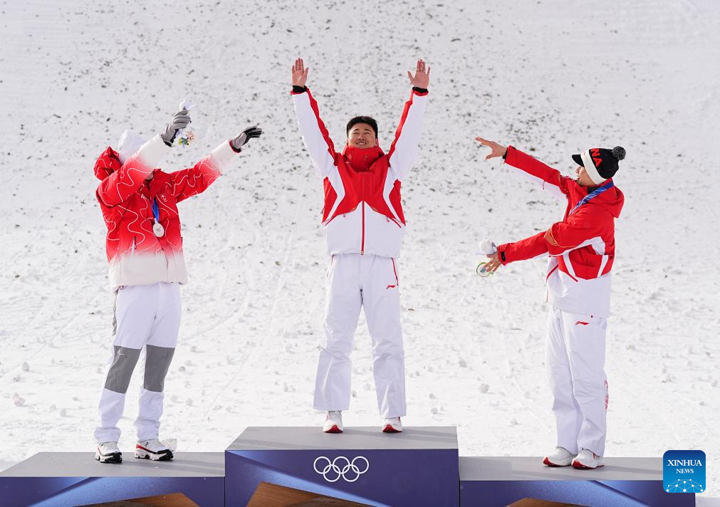 Gold medalist Wang Xindi (C) of China reacts during the awarding ceremony of the freestyle skiing men’s aerials at the Milan-Cortina 2026 Olympic Winter Games in Livigno, Italy, Feb. 20, 2026. (Xinhua/Wu Huiwo)