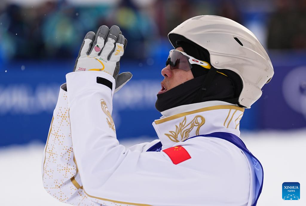 Gold medalist Wang Xindi of China celebrates winning after the freestyle skiing men’s aerials final 2 at the Milan-Cortina 2026 Olympic Winter Games in Livigno, Italy, Feb. 20, 2026. (Xinhua/Wu Huiwo)