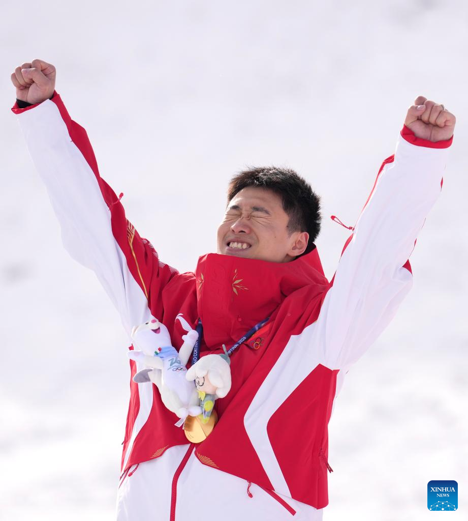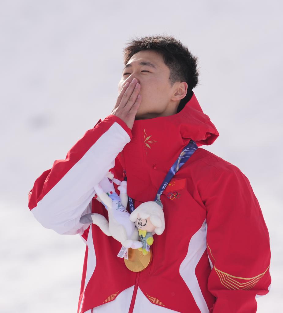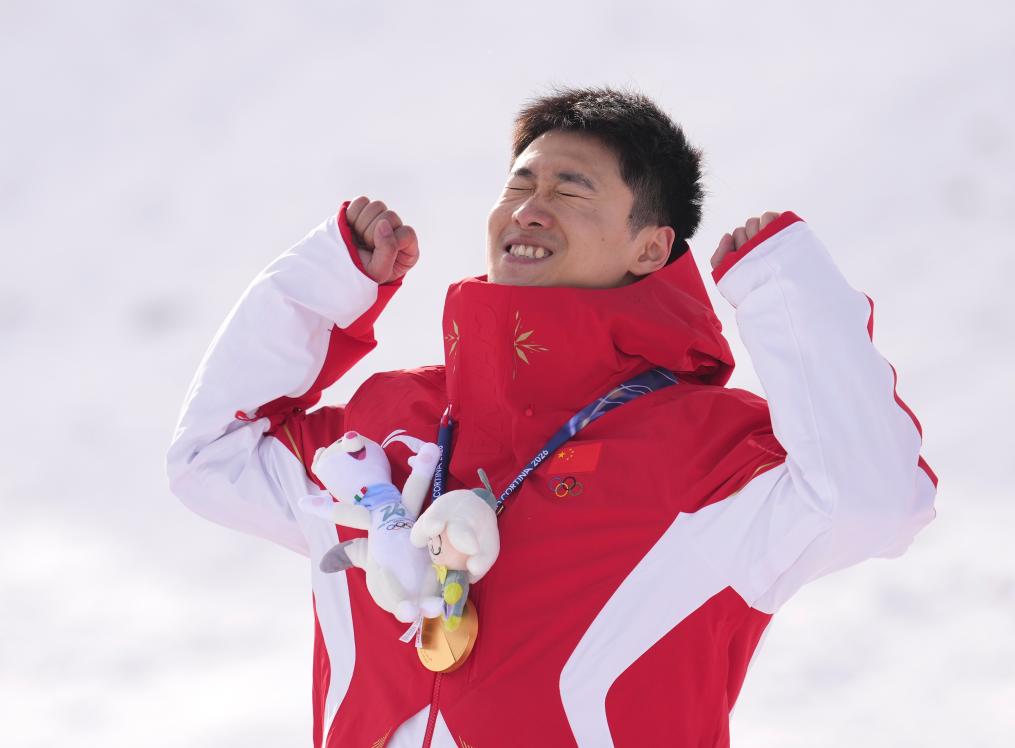 Gold medalist Wang Xindi of China celebrates during the awarding ceremony of the freestyle skiing men’s aerials at the Milan-Cortina 2026 Olympic Winter Games in Livigno, Italy, Feb. 20, 2026. (Xinhua/Hu Chao)