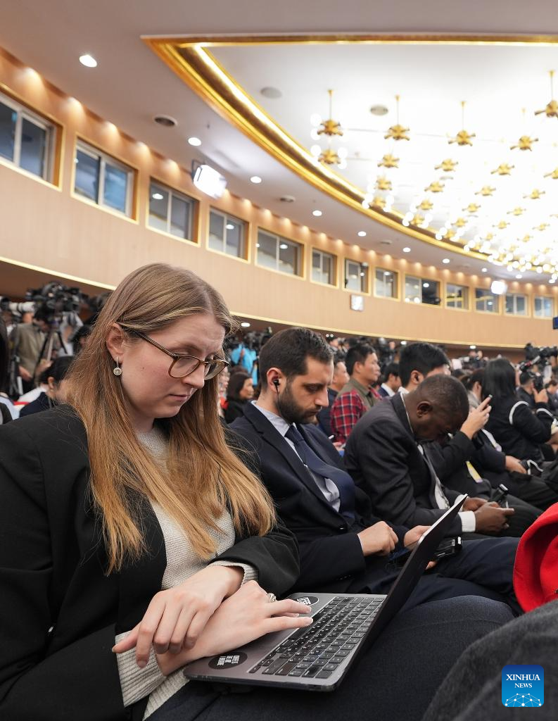 Journalists work at a press conference attended by Chinese Foreign Minister Wang Yi on the sidelines of the fourth session of the 14th National People’s Congress (NPC) in Beijing, capital of China, March 8, 2026. Wang, also a member of the Political Bureau of the Communist Party of China Central Committee, answered questions of journalists from home and abroad on China’s foreign policy and external relations during the press conference on Sunday. (Xinhua/Li Xin)