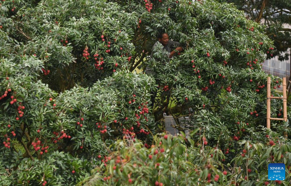 A farmer picks lychees at an orchard in Gaozhou City, south China’s Guangdong Province, June 4, 2025.