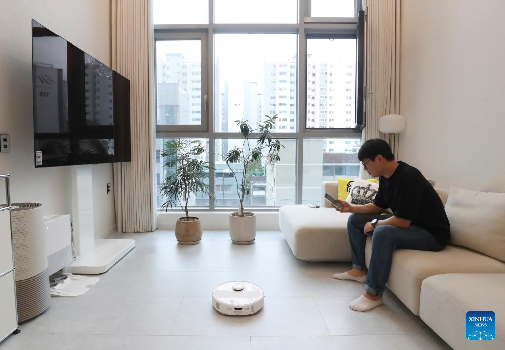 A costumer uses a robot vacuum cleaner at his home in Seoul, South Korea, Oct. 13, 2025. (Xinhua/Yao Qilin)