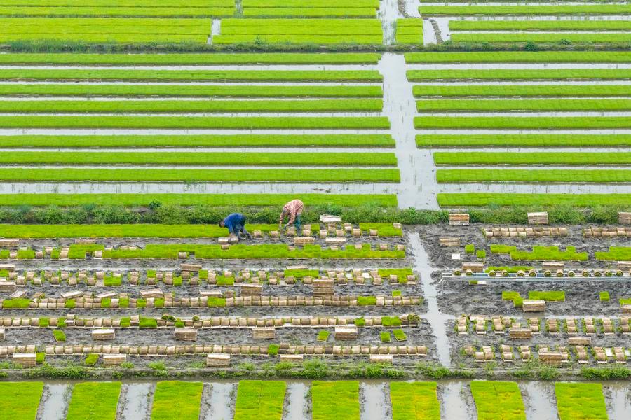 An aerial drone photo taken on April 10, 2026 shows farmers transporting early-season rice seedlings in Shangtang Village of Huangjiabu Town, Yuyao, east China’s Zhejiang Province. (Photo by Zhang Hui/Xinhua)