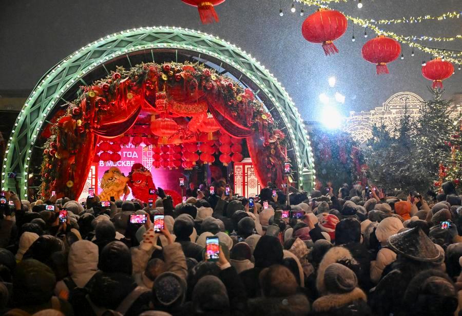 On Monday, also the Chinese New Year’s Eve, the third “Happy Chinese New Year” event opened at Manezhnaya Square in Moscow. Despite temperatures dropping to minus 15 degrees Celsius and the day falling on a workday, residents and tourists gathered at the venue in falling snow to join the celebrations.